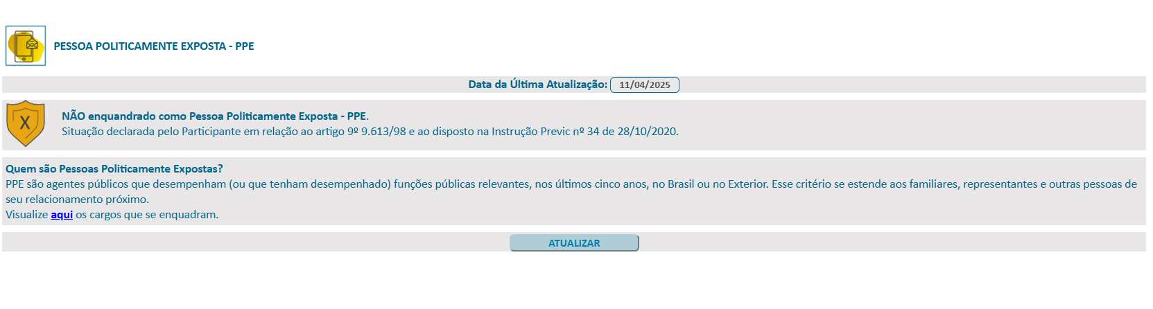 A TELOS reforça a importância de manter atualizado o formulário de Pessoa Politicamente Exposta – PPE, informação obrigatória para acesso à área de Autoatendimento do site e para a realização de serviços como escolha de alocação de recursos e aportes.