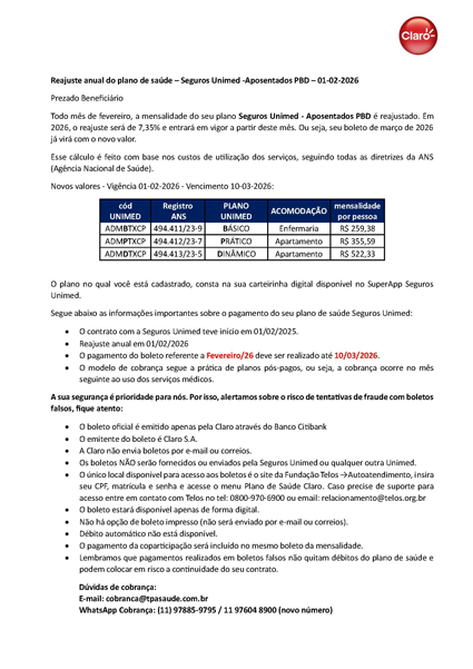 Informamos que em fevereiro será aplicado o reajuste da mensalidade do seu plano de saúde da Seguros Unimed disponibilizado pela Claro.