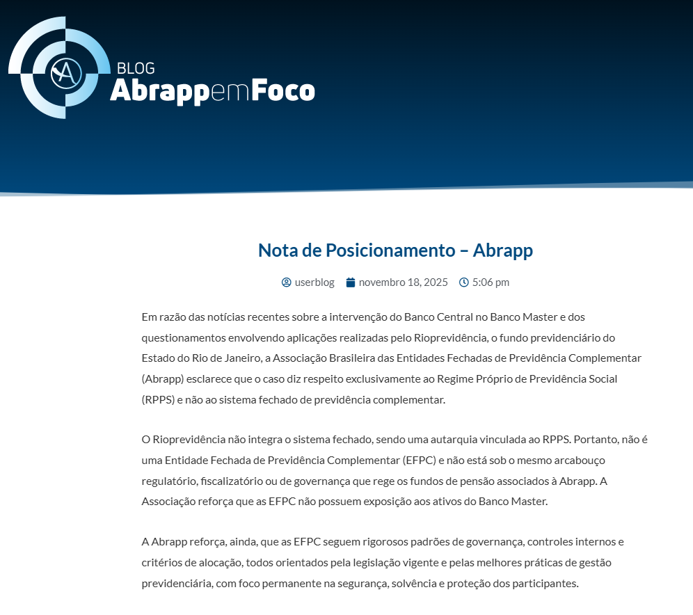 3. NOTA DE POSICIONAMENTO DA ABRAPP SOBRE AS ENTIDADES FECHADAS DE PREVIDÊNCIA COMPLEMENTAR E O BANCO MASTER