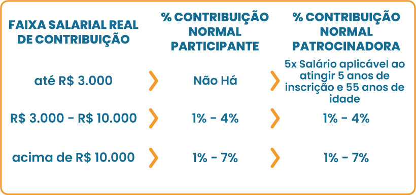 - Participantes Ativos inscritos a partir de 1º de novembro de 2014, enquadrados na Faixa Salarial 1, podem realizar Contribuição Adicional do Participante, porém sem contrapartida da Patrocinadora. Ressalta-se que, ao completar 5 anos de inscrição no plano e atingir 55 anos de idade — condição que o torna apto à aposentadoria normal — o Participante Ativo recebe da Patrocinadora uma contribuição única equivalente a 5x o seu salário, por exemplo, caso receba provento no valor de R$ 2.500,00, a Patrocinadora contribuirá com R$ 12.500,00.