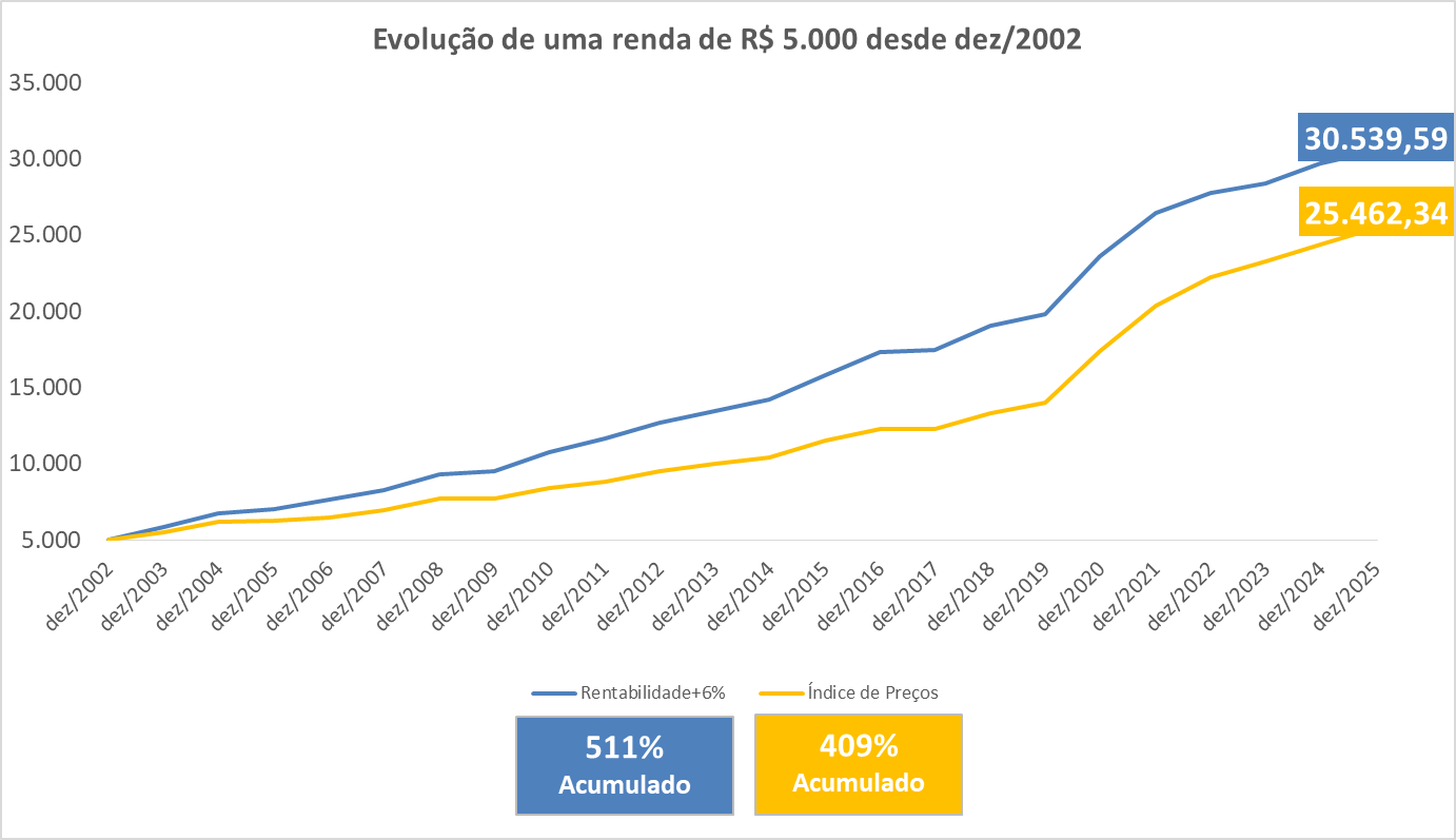 Isso significa que, em dez/2025, o Benefício TELOS de quem escolheu o reajuste pela rentabilidade líquida está cerca de 20% maior do que estaria caso a opção tivesse sido pelo índice de preços em dez/2002.